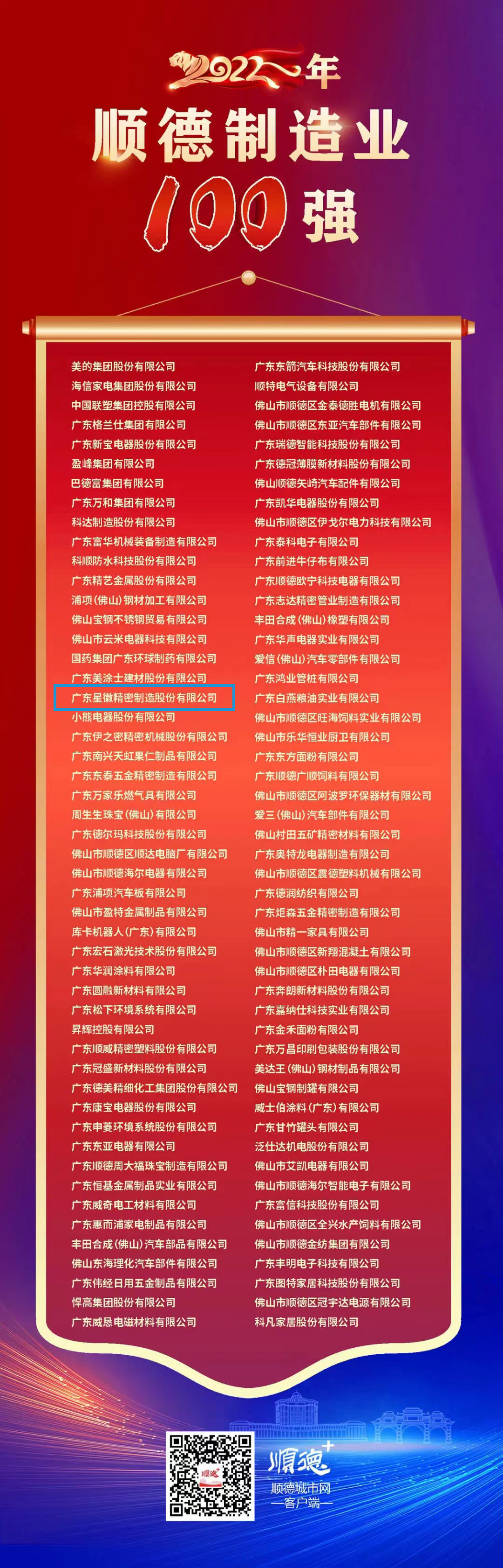 9月25日,“深耕順德,共享未來”順德區(qū)制造業(yè)百強(qiáng)發(fā)布會暨重大項(xiàng)目簽約活動在順德舉行。活動上,順德區(qū)首次發(fā)布了“2022年順德制造業(yè)100強(qiáng)”榜單并為代表企業(yè)授牌。憑借強(qiáng)勁的綜合實(shí)力和品牌影響力,星徽精密進(jìn)入前20強(qiáng),位列百強(qiáng)榜第十八,奪得家居五金行業(yè)桂冠。